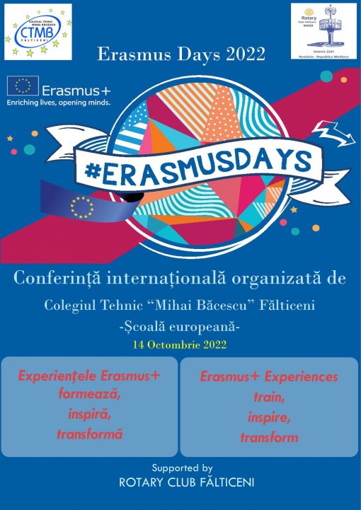 Colegiul Tehnic ”Mihai Băcescu” Fălticeni, Suceava, România organizează această Conferință internațională pentru a sărbători Zilele Erasmus 2022.