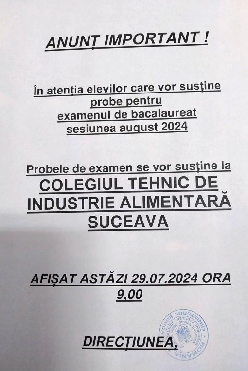 Anunț Bacalaureat sesiunea August Septembrie 2024 CALENDAR BACALAUREAT AUGUST 2024 https://www.edu.ro/bacalaureat July 29, 2024 Colegiul Tehnic MIHAI BĂCESCU - Fălticeni Acasă No Comment «Rezultate finale Bacalaureat 2024 ANUNT CONCURS POST MUNCITOR CALIFICAT I» Leave a Reply Cancel replyYou must be logged in to post a comment.