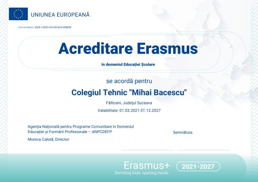 În urma evaluării aplicației depuse, Colegiul Tehnic „Mihai Băcescu” din Fălticeni a obținut Acreditarea pentru proiecte Erasmus+, Acțiunea cheie 1, mobilități ale personalului didactic în domeniul Educației școlare, pentru perioada 01.03.2021-31.12.2027. Acreditarea a fost conferită de Agenția Națională pentru Programe Comunitare în Domeniul Educației și Formării Profesionale.