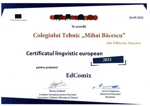 Școala noastră deține Certificatul Lingvistic European – European Language Label 2021, distincție acordată în cadrul evenimentului online LinguaFEST 10 organizat de Agenția Națională pentru Programe Comunitare în domeniul Formării Profesionale (ANCPDEFP) și Erasmus+ România pentru rezultate și bune practici în cadrul proiectului european EdComix (www.edcomix.eu)